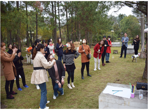 上午10點我們到達活動場地:苗山生態(tài)園。為了增加業(yè)務和導購的親近感,考驗隊員配合協作能力,到達場地,我們將所有人員分成三組,選出三名隊長和隊名:苗山隊、寶劍隊、先鋒隊。