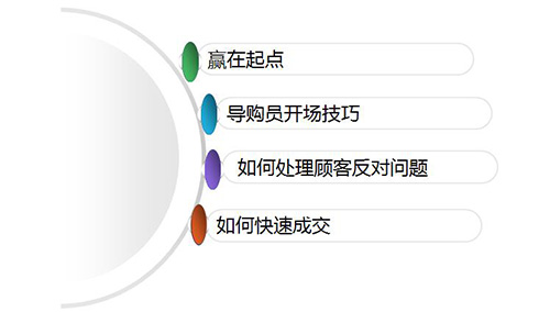 本次培訓按照銷售的流程順序,分別從顧客接待、銷售開場、講解產(chǎn)品、激發(fā)購買欲望、恰當商談、處理反對問題、處理價格異議、掌握結束契機等方面詳細講解銷售實戰(zhàn)技巧。